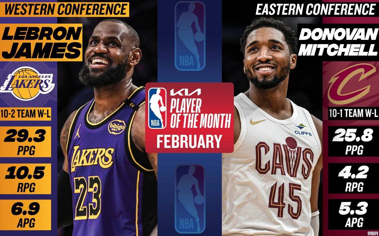 北京时间3月5日消息,NBA官方宣布,骑士队的多诺万-米切尔和湖人队的勒布朗-詹姆斯荣膺2月东西部最佳球员。